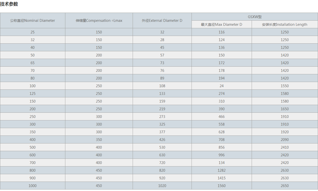 公稱直徑Nominal Diameter 伸縮量Compensation △Lmax 外徑External Diameter D GSXW型