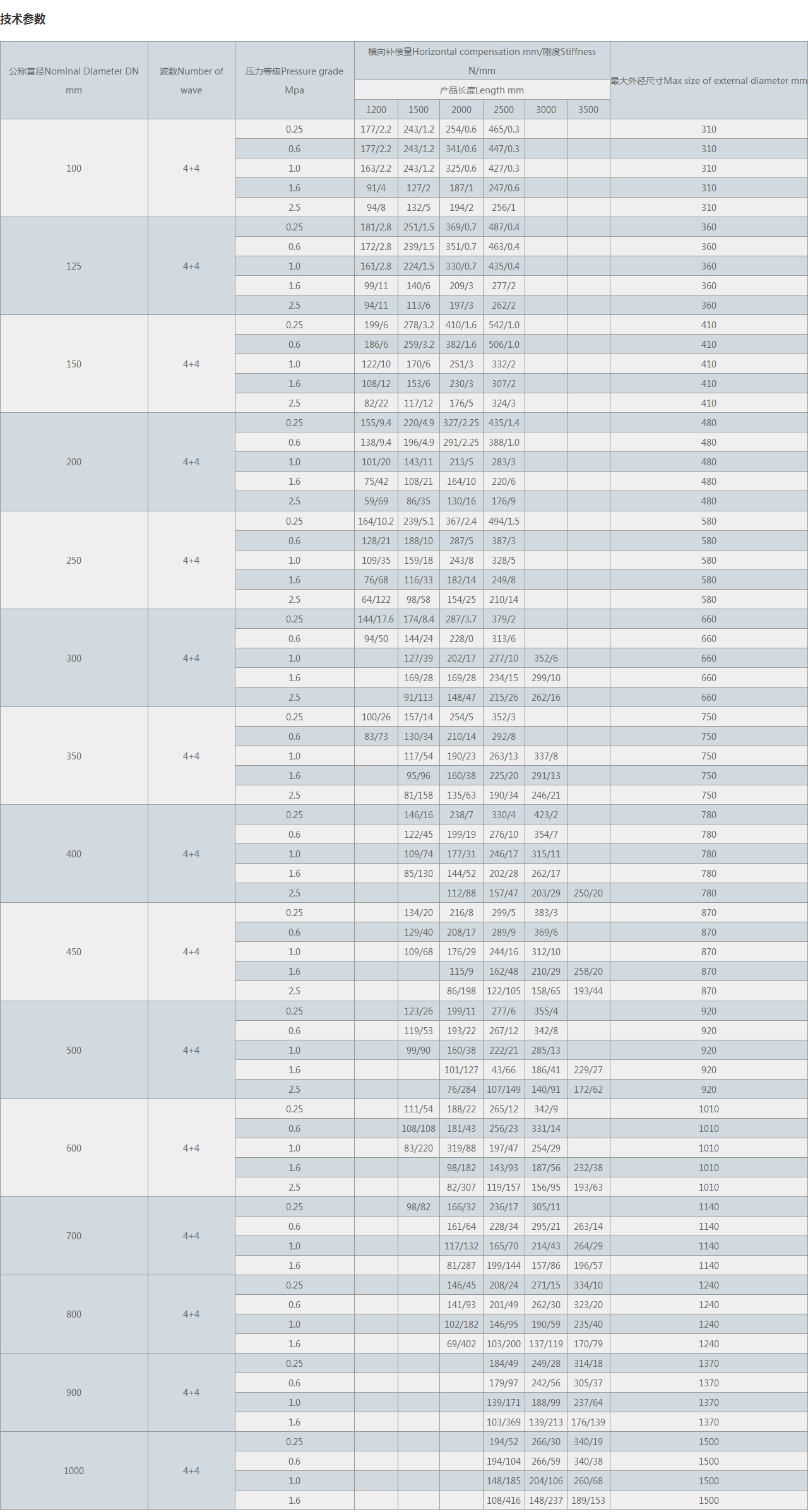 公稱直徑Nominal Diameter DN mm 波數(shù)Number of wave 壓力等級Pressure grade Mpa 橫向補償量Horizontal compensation mm/剛度Stiffness N/mm 很大外徑尺寸Max size of external diameter mm