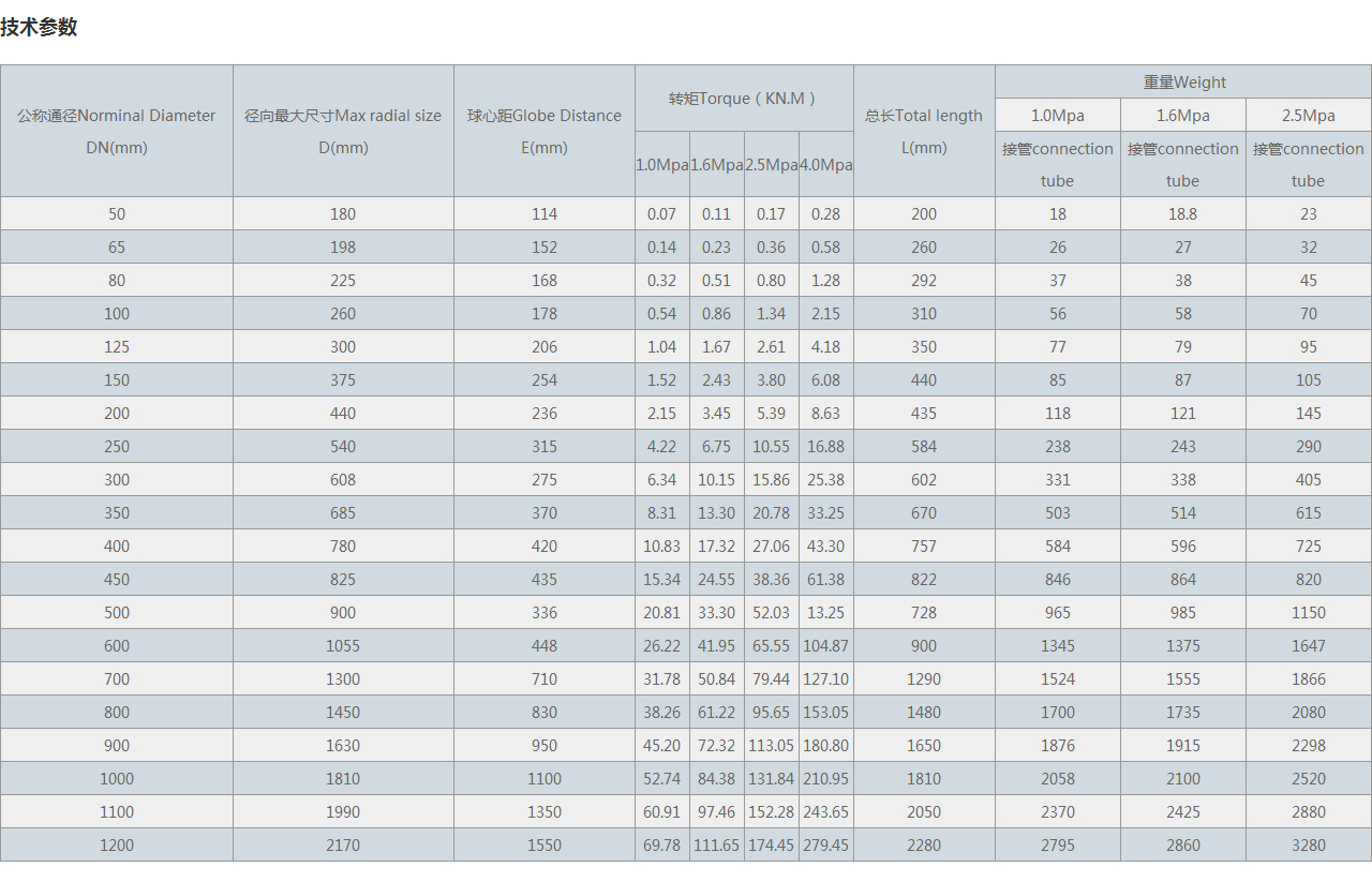 公稱(chēng)通徑Norminal Diameter DN(mm) 徑向很大尺寸Max radial size D(mm) 球心距Globe Distance E(mm) 轉(zhuǎn)矩Torque(KN.M) 總長(zhǎng)Total length L(mm)  重量Weight