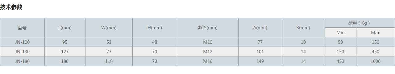 型號 L(mm) W(mm) H(mm) ΦCS(mm) A(mm) B(mm) 荷重(Kg)