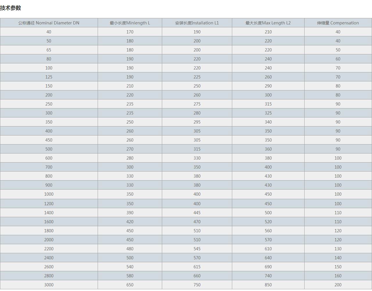 公稱通徑 Nominal Diameter DN 很小長(zhǎng)度Minlength L 安裝長(zhǎng)度Installation L1 很大長(zhǎng)度Max Length L2 伸縮量 Compensation