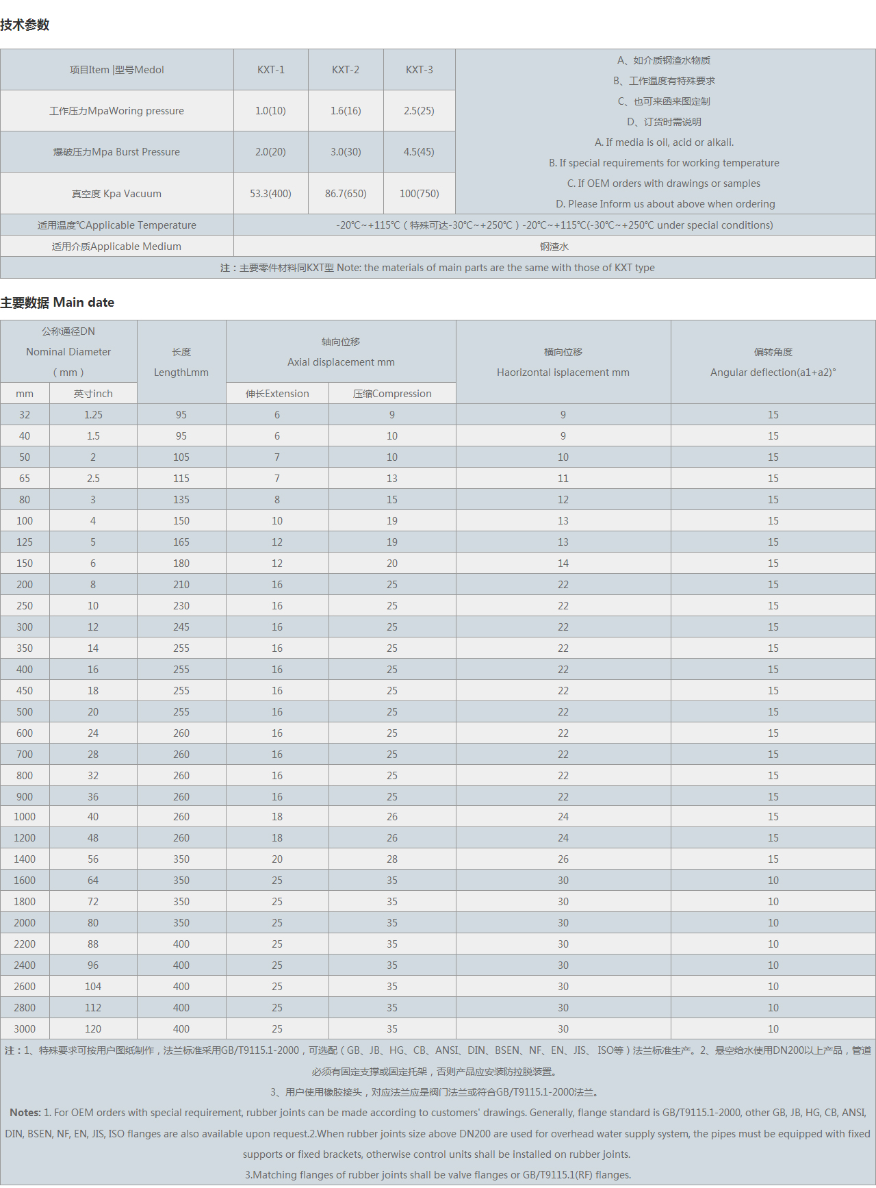 Notes: 1. For OEM orders with special requirement, rubber joints can be made according to customers' drawings. Generally, flange standard is , other GB, JB, HG, CB, ANSI, DIN, BSEN, NF, EN, JIS, flanges are also available upon request. Material of rubber body can be NR natural rubber, EPDM, Neoprene, IIR butyl rubber, NBR Buna-N, FKM, etc.